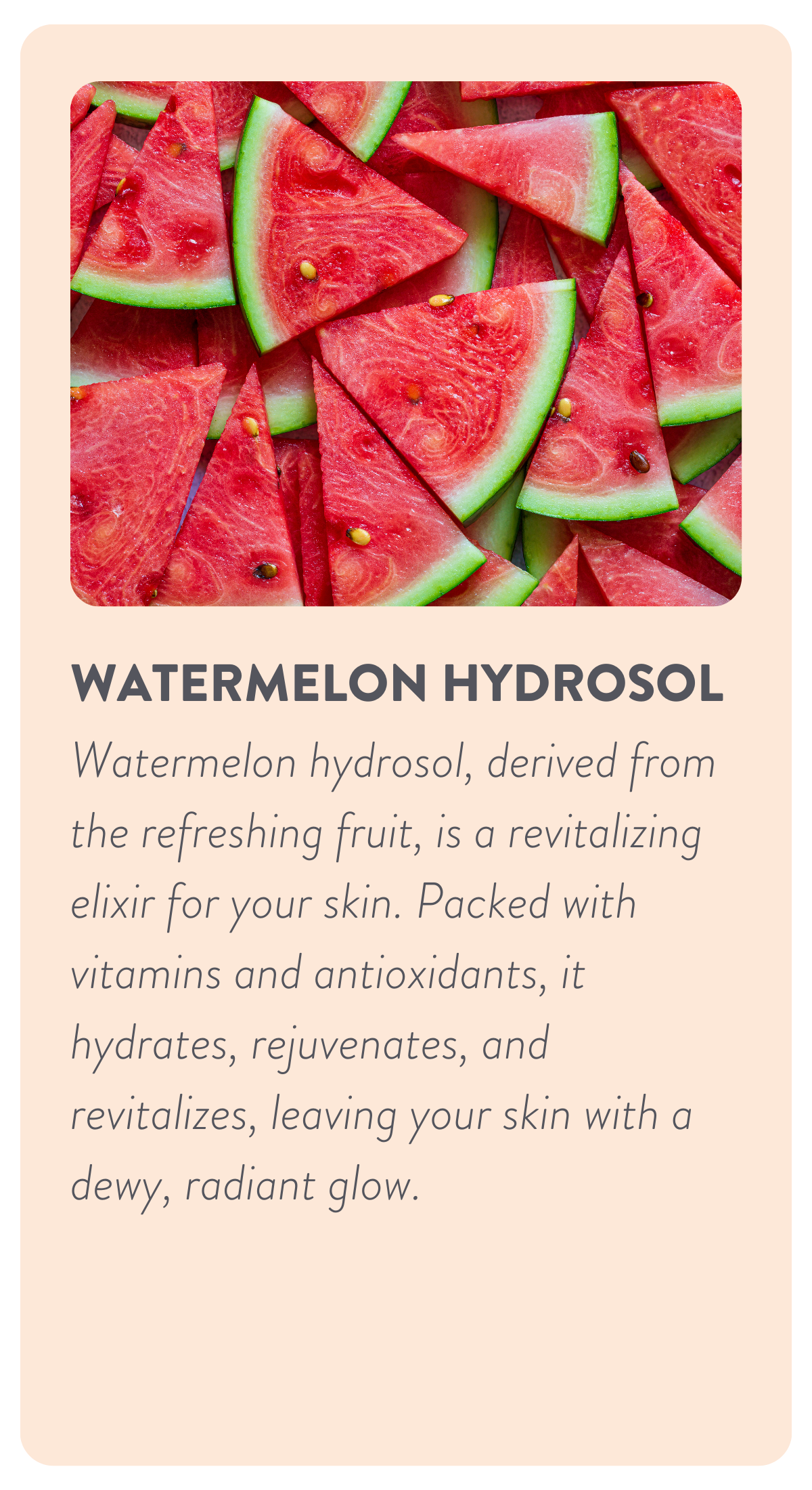 Watermelon Hydrosol (Citrullus vulgaris), Aloe Vera Hydrosol (Aloe barbadensis).