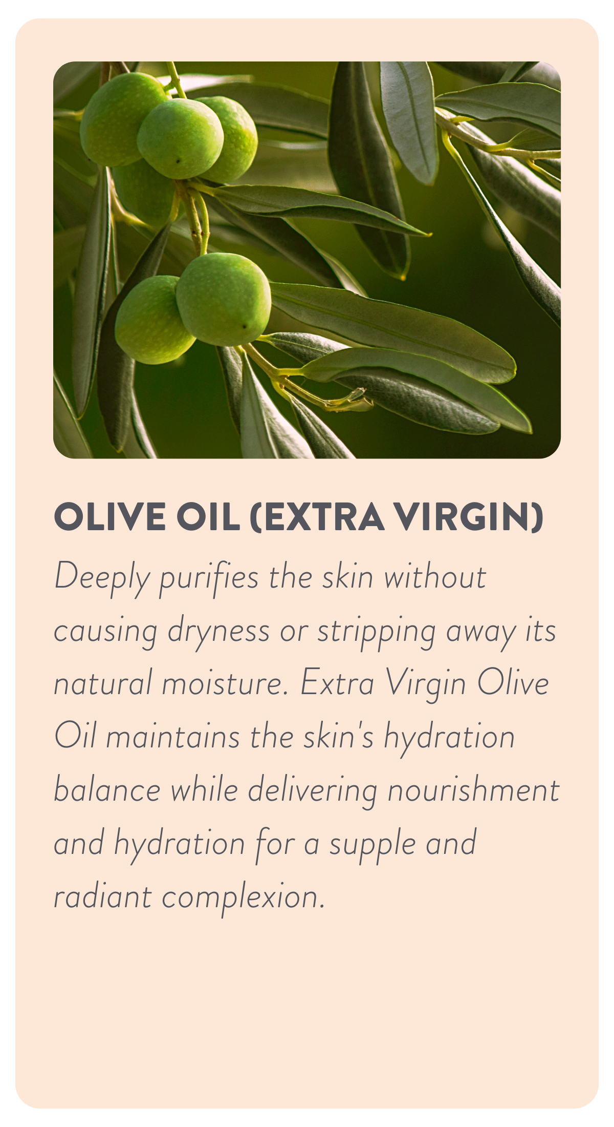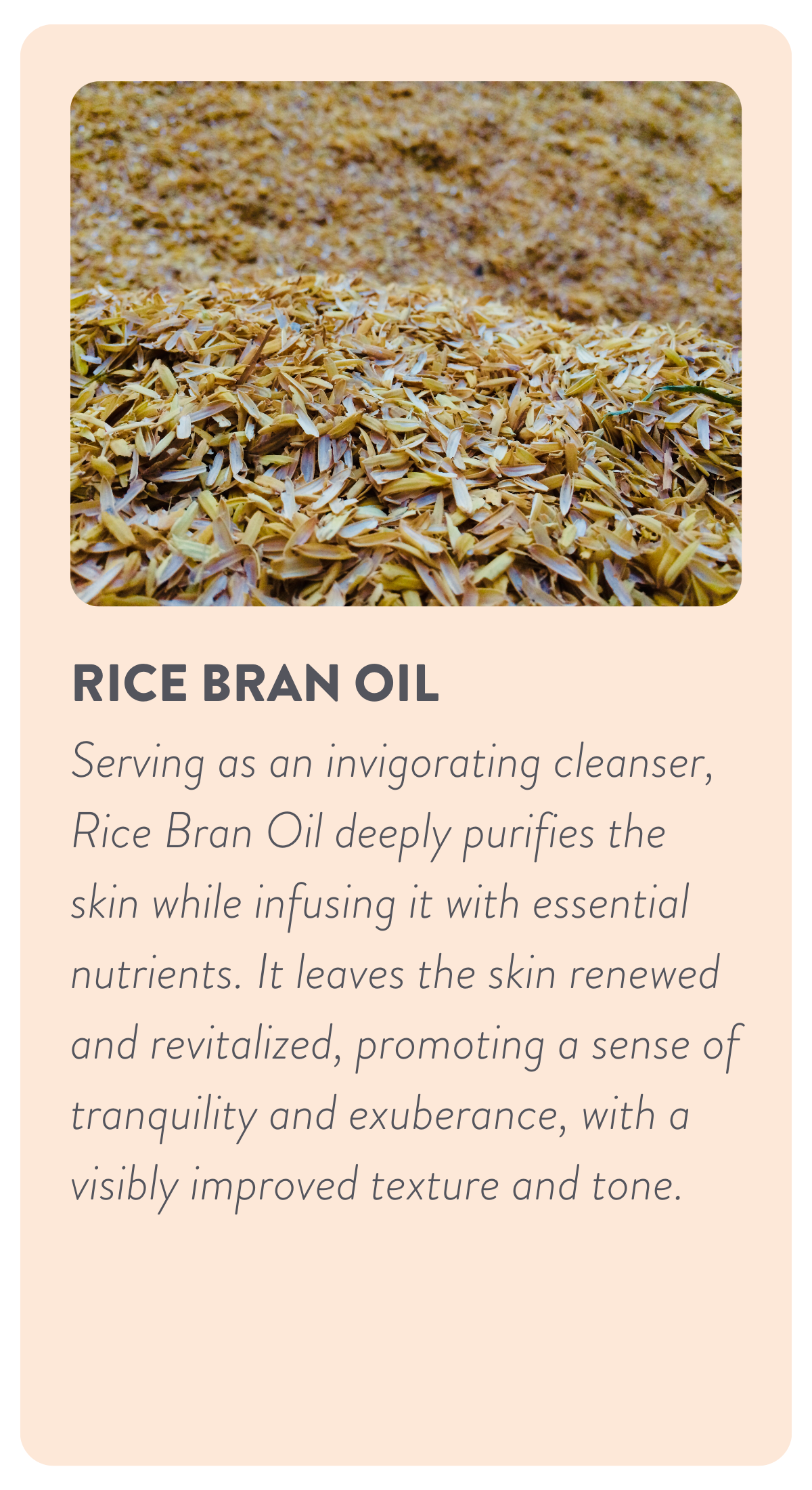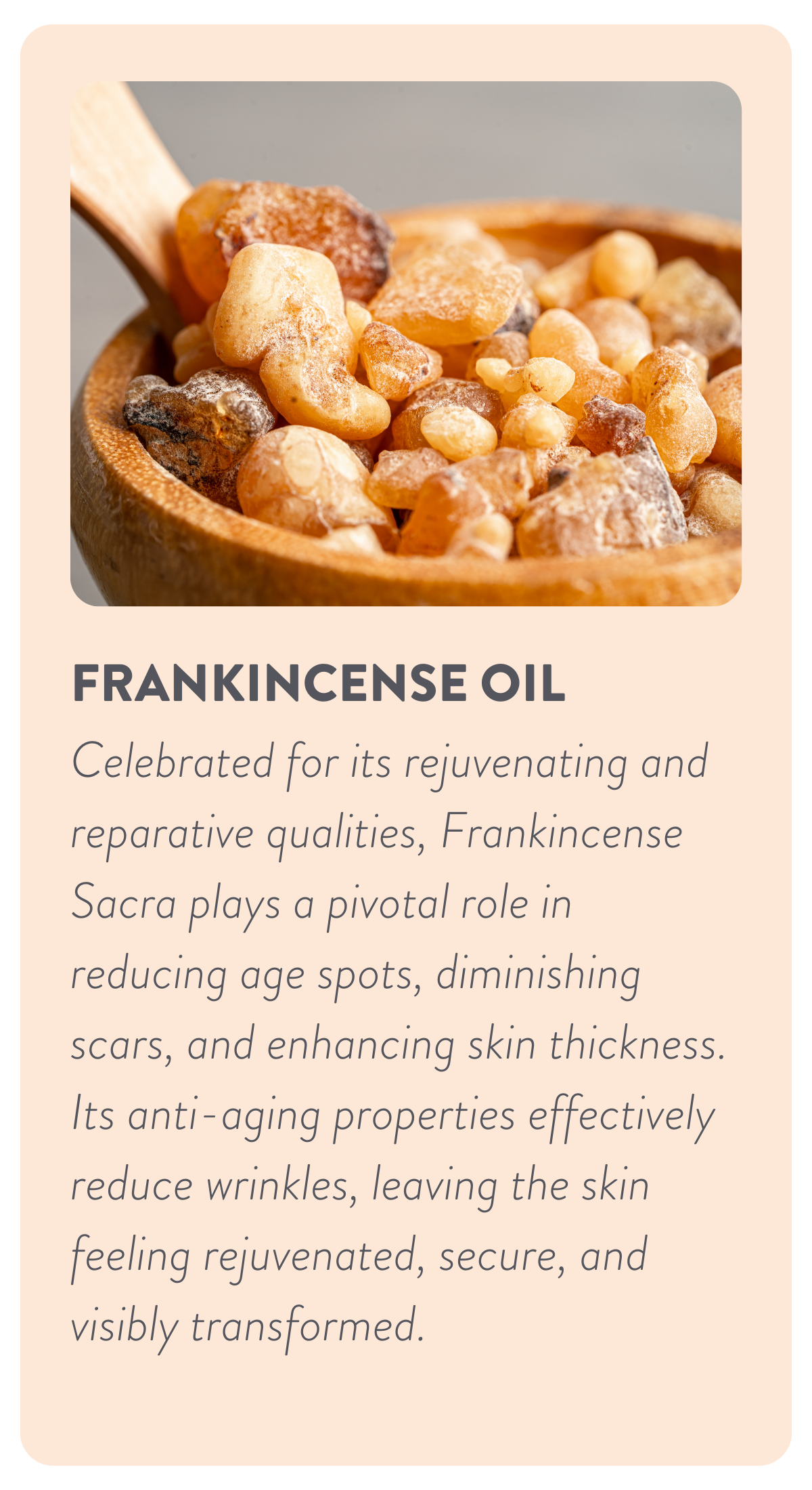 Rice Bran Oil (Oryza sativa), Castor Oil (Ricinus communis), Grape Seed Oil (Vitis vinifera), Extra Virgin Olive Oil (Olea Europaea), Rosehip Oil (Rosa rubiginosa), Jojoba Oil (Simmondsia chinensis), Frankincense Sacra Oil (Boswellia sacra), Myrrh Oil (Commiphora myrrha), Vetiver Oil (Chrysopogon zizanioides).