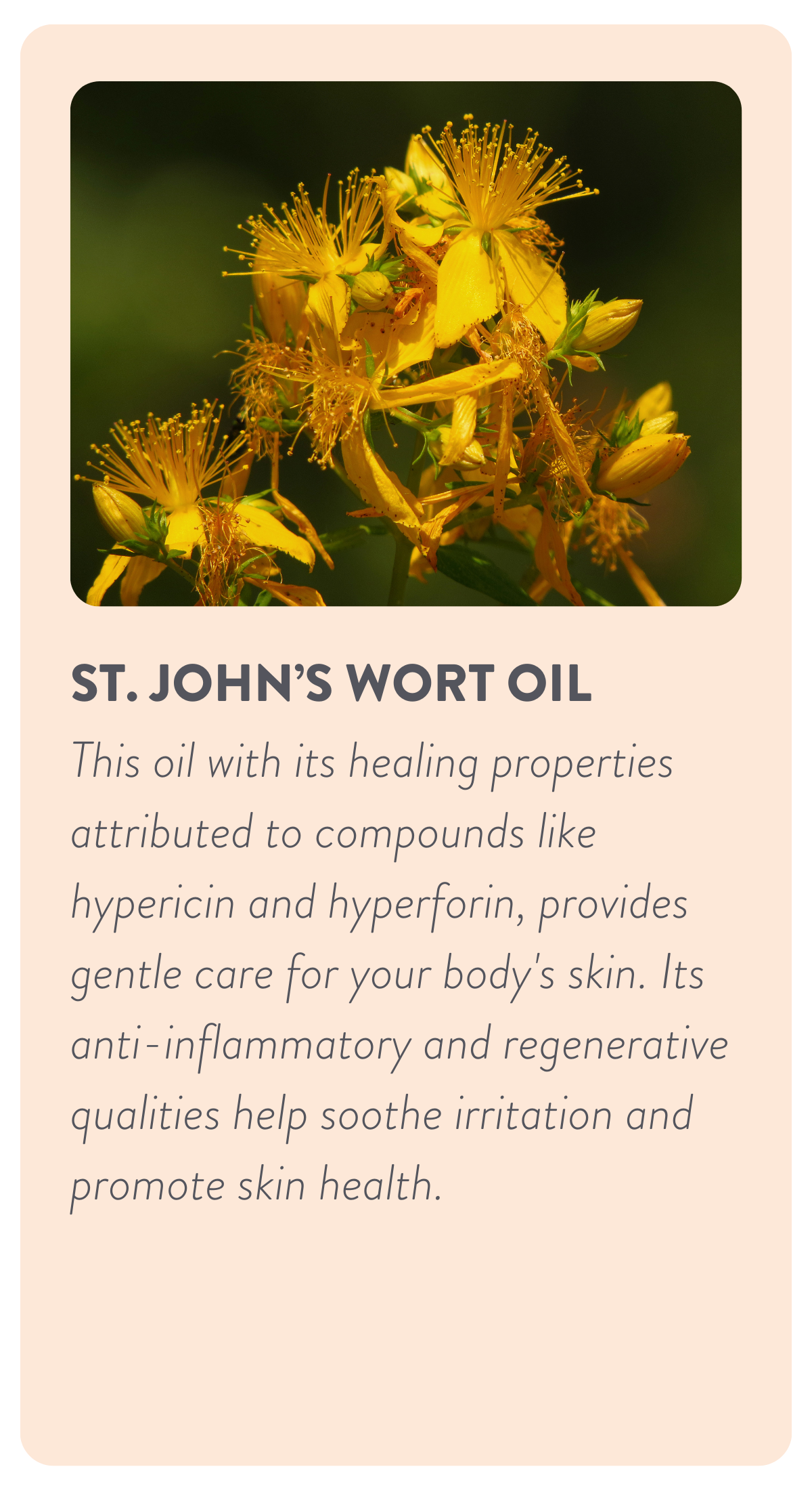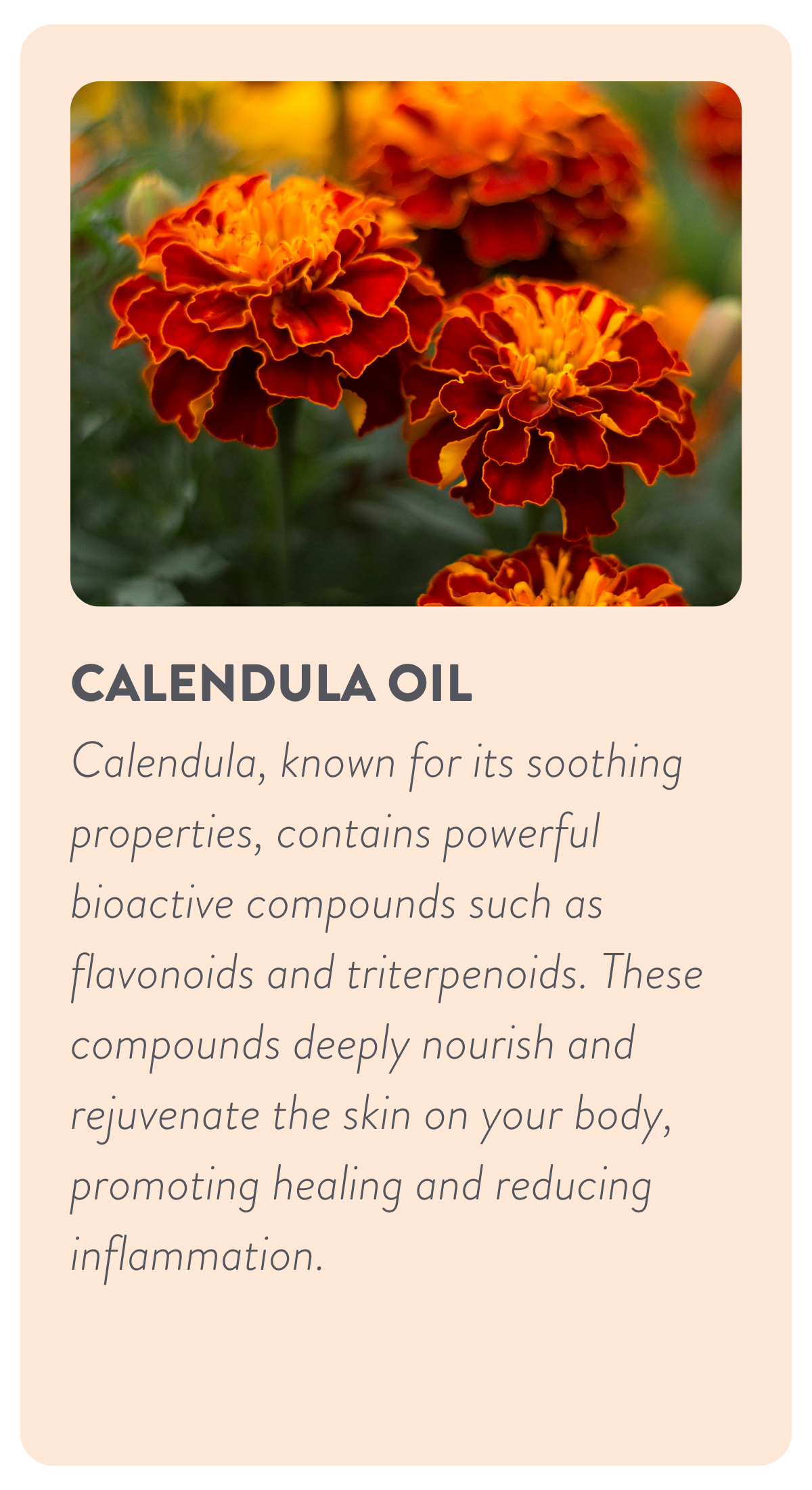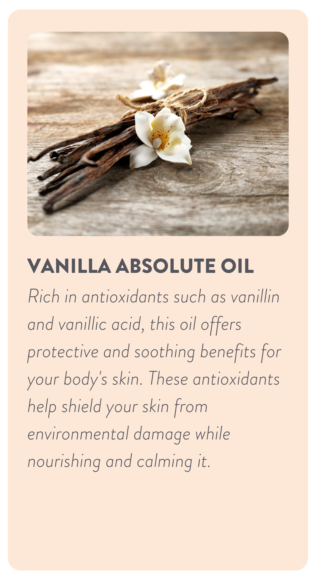 Calendula Oil (Calendula officinalis), Sesame Oil (Sesamum indicum), St. John's Wort Oil (Hypericum perforatum), Vanilla Hydrosol (Vanilla planifolia), Vanilla Absolute Oil (Vanilla planifolia), Cocoa Absolute Oil (Theobroma cacao).