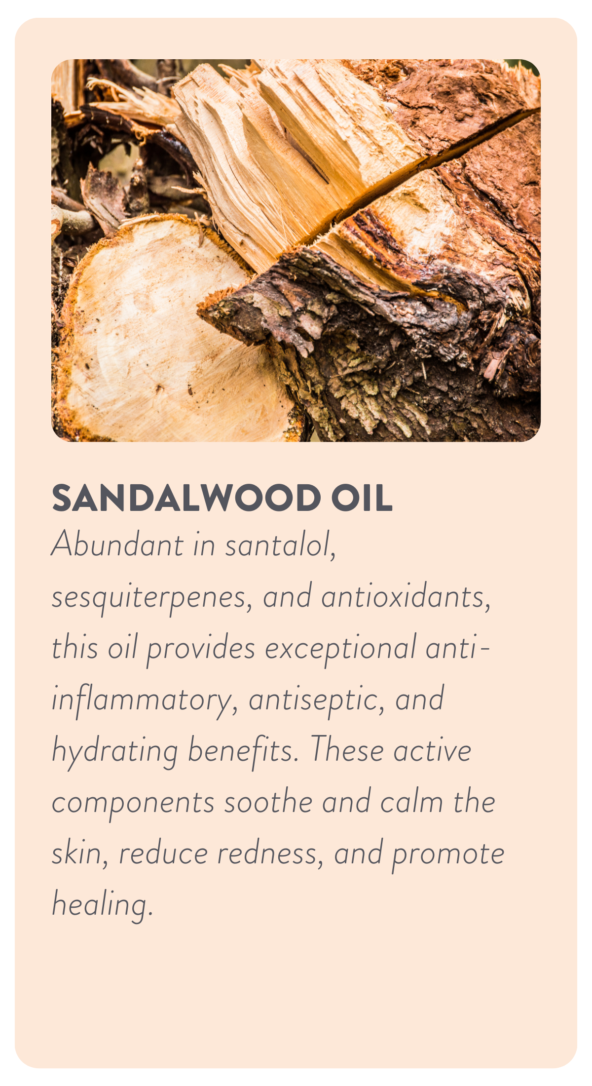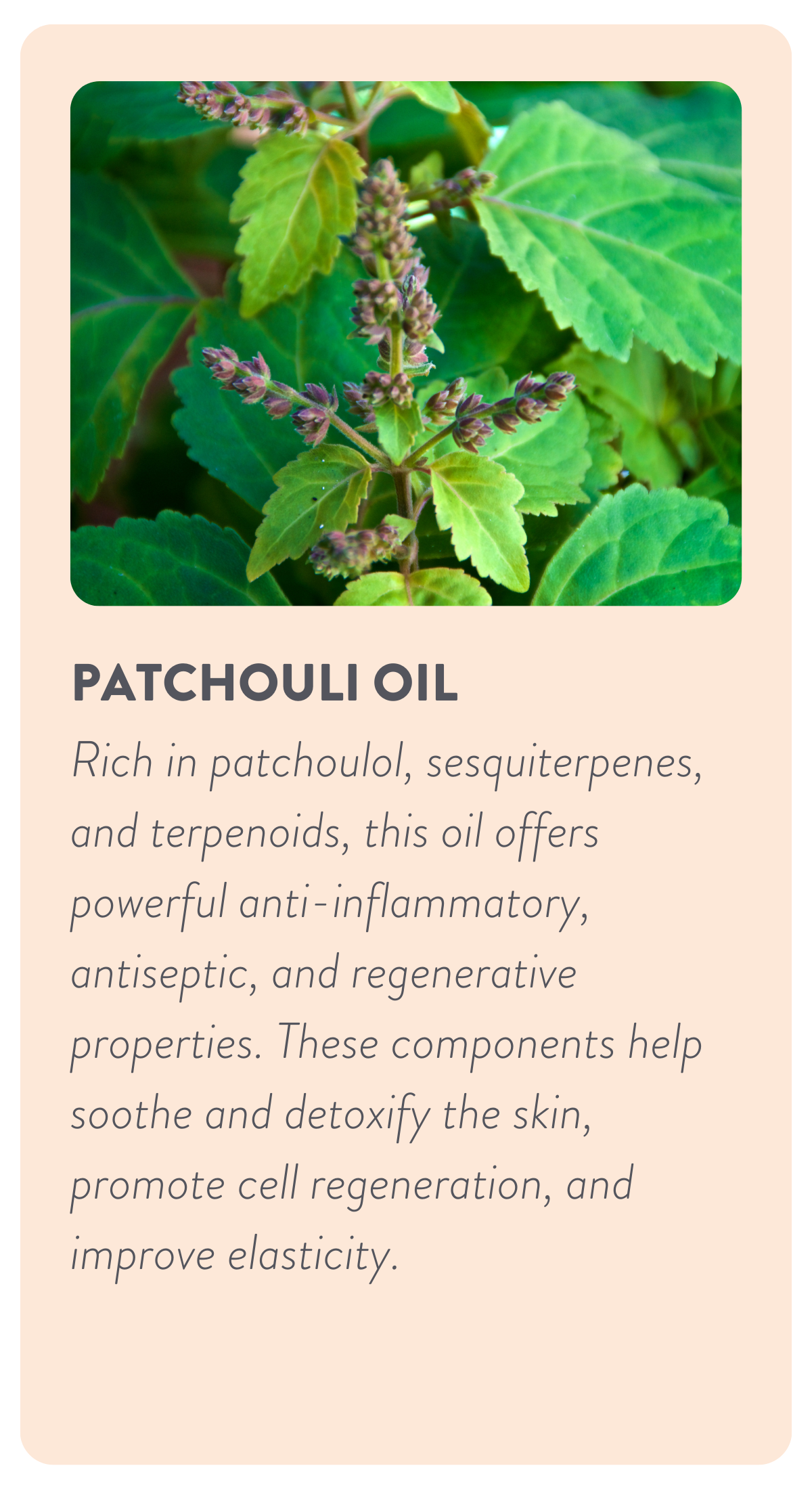 Calendula Oil (Calendula officinalis), Sesame Oil (Sesamum indicum), St. John's Wort Oil (Hypericum perforatum), Vanilla Absolute Oil (Vanilla planifolia), Cocoa Absolute Oil (Theobroma cacao), Vetiver Oil (Chrysopogon zizanioides), Sandalwood Oil (Santalum album), Patchouli Oil (Pogostemon cablin).