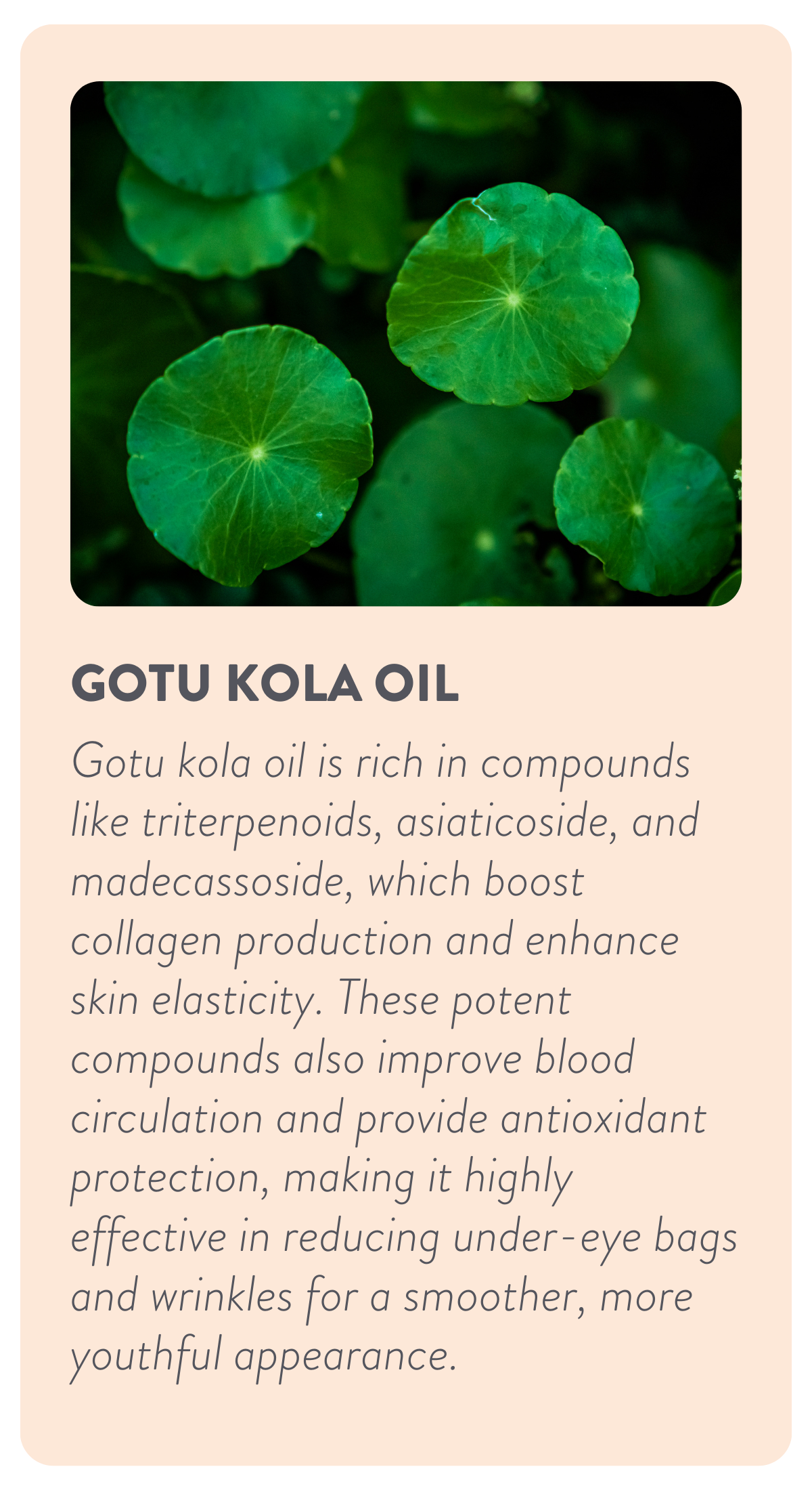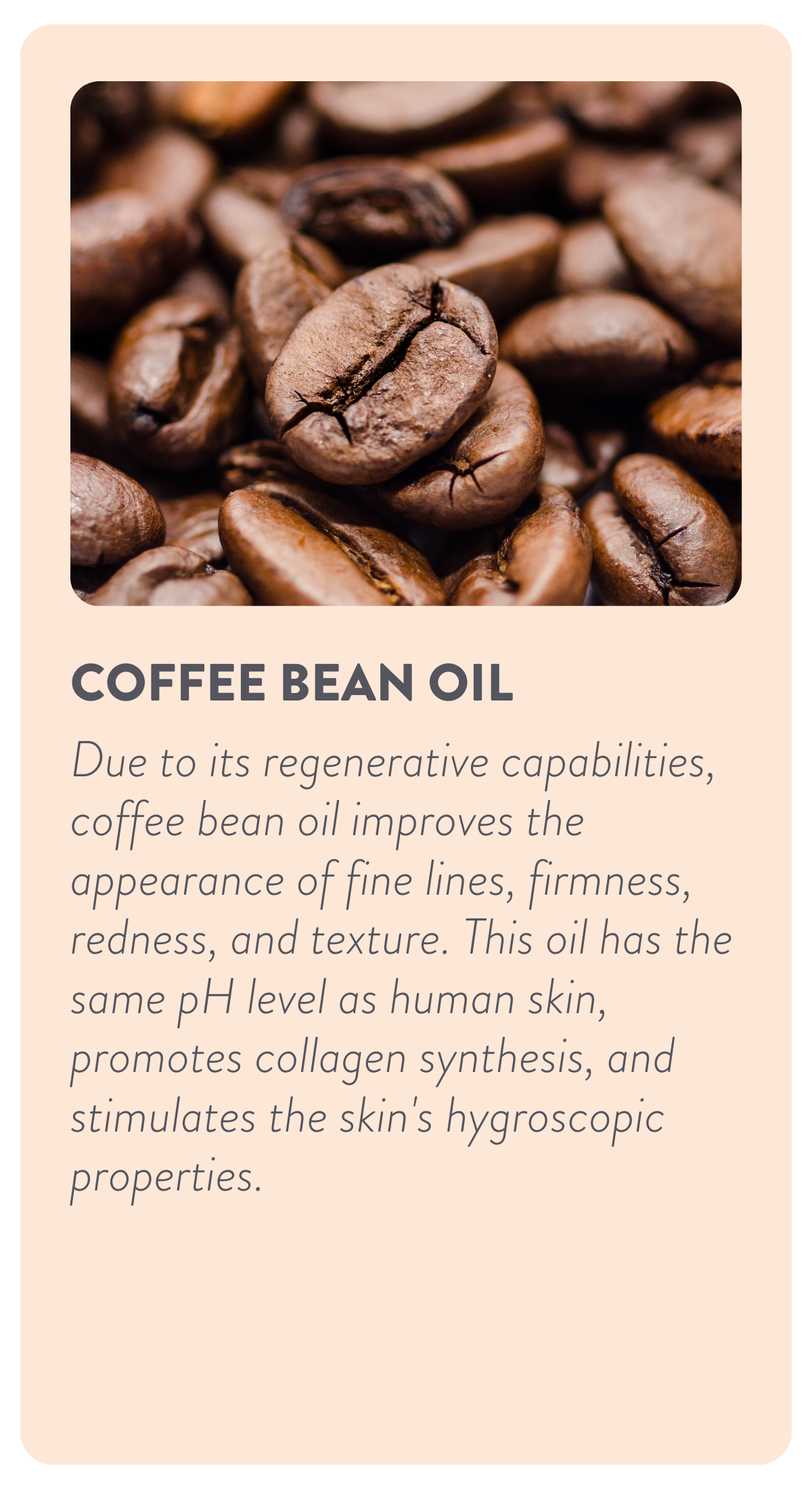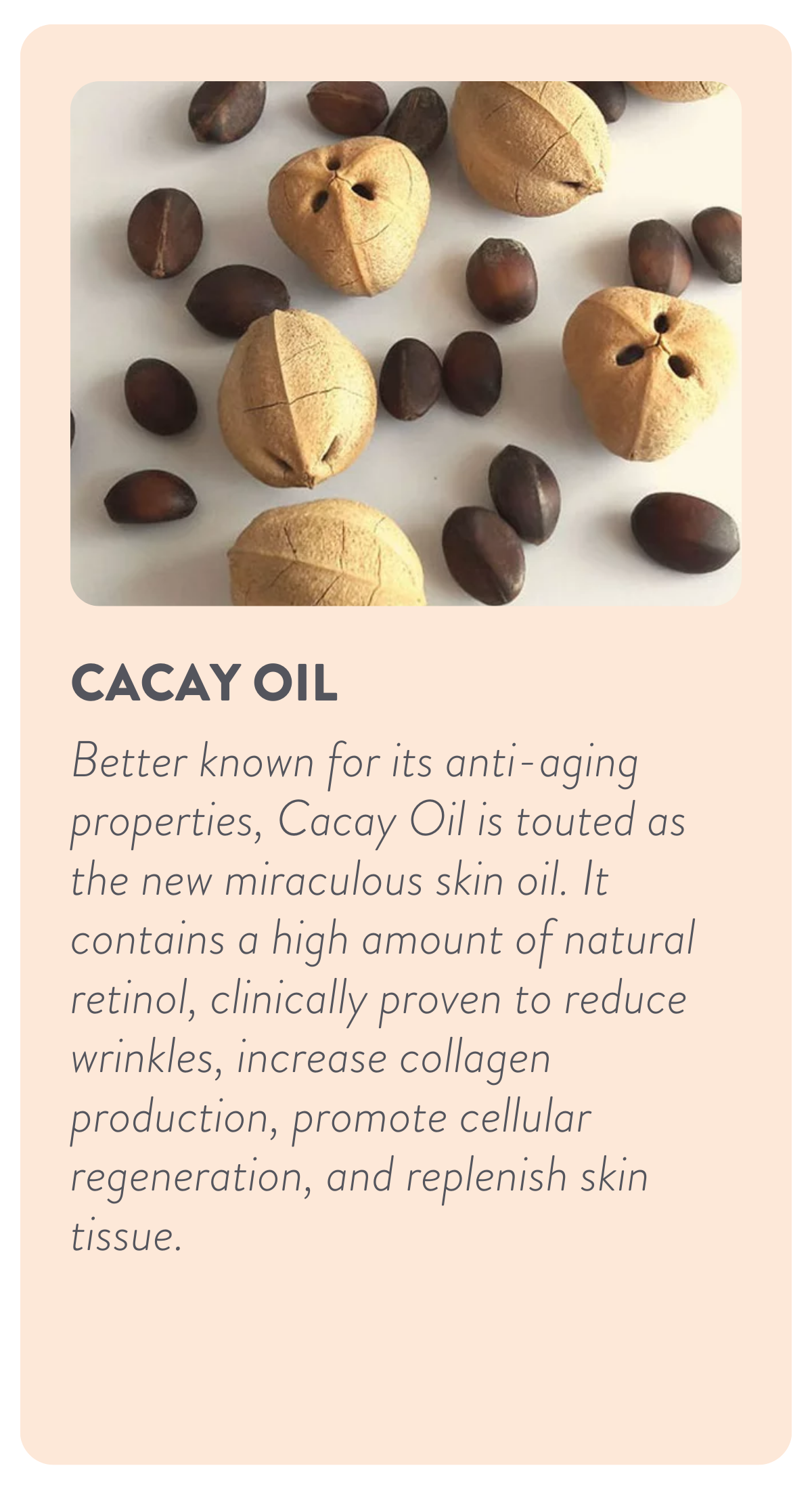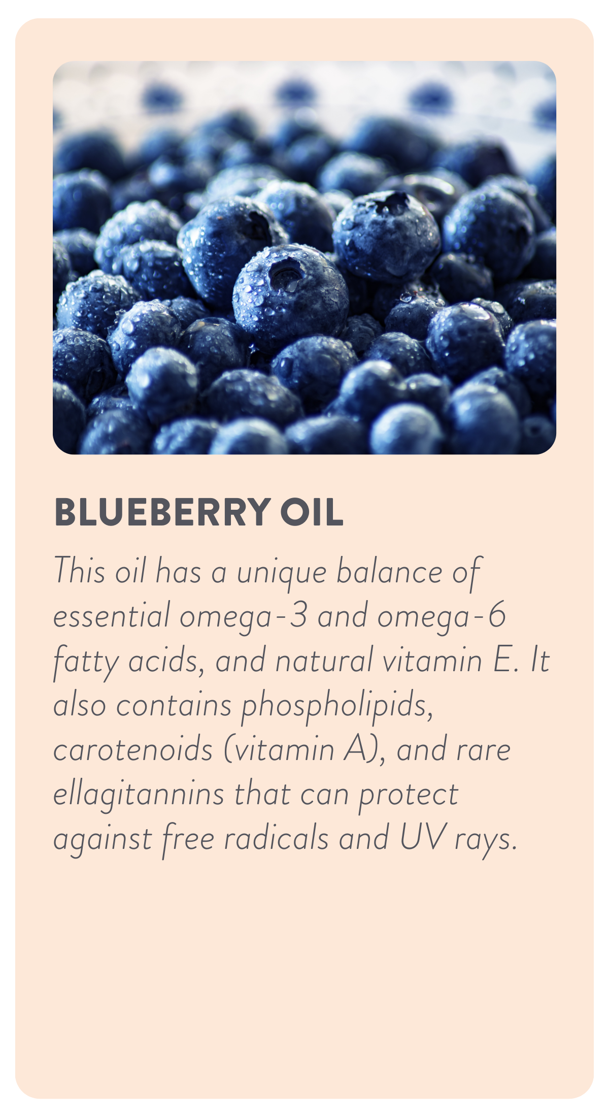 Blueberry Oil (Vaccinium corymbosum), Coffee Oil (Coffea arabica), Cacay Oil (Orinocense Caryodendron), Raspberry Oil (Rubus idaeus), Black Raspberry Oil (Rubus occidentalis), Sea Buckthorn Oil (Hippophae rhamnoides), Sea Buckthorn Seed Oil (Hippophae rhamnoides), Plum Oil (Prunus domestica), Gotu Kola Oil (Centella asiatica), Coenzyme Q10 (With Vitamin E & C), Vitamin E, Vitamin A, Myrrh Oil (Commiphora myrrha), Frankincense Oil (Boswellia sacra), Q-MAX, Vegetable-derived C13-C15 Alkane.