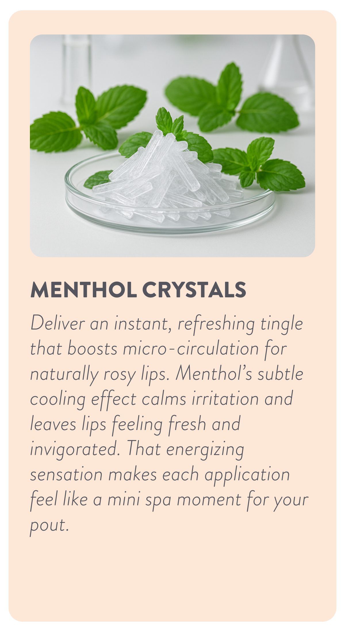 Natural Gel Wax, Banana Oil, Cocoa Absolute Oil, Vitamin C (L-Ascorbyl Palmitate), Lip Peptide Complex (Tripeptide-1), Vitamin E (Tocopherol), Menthol Crystals.
