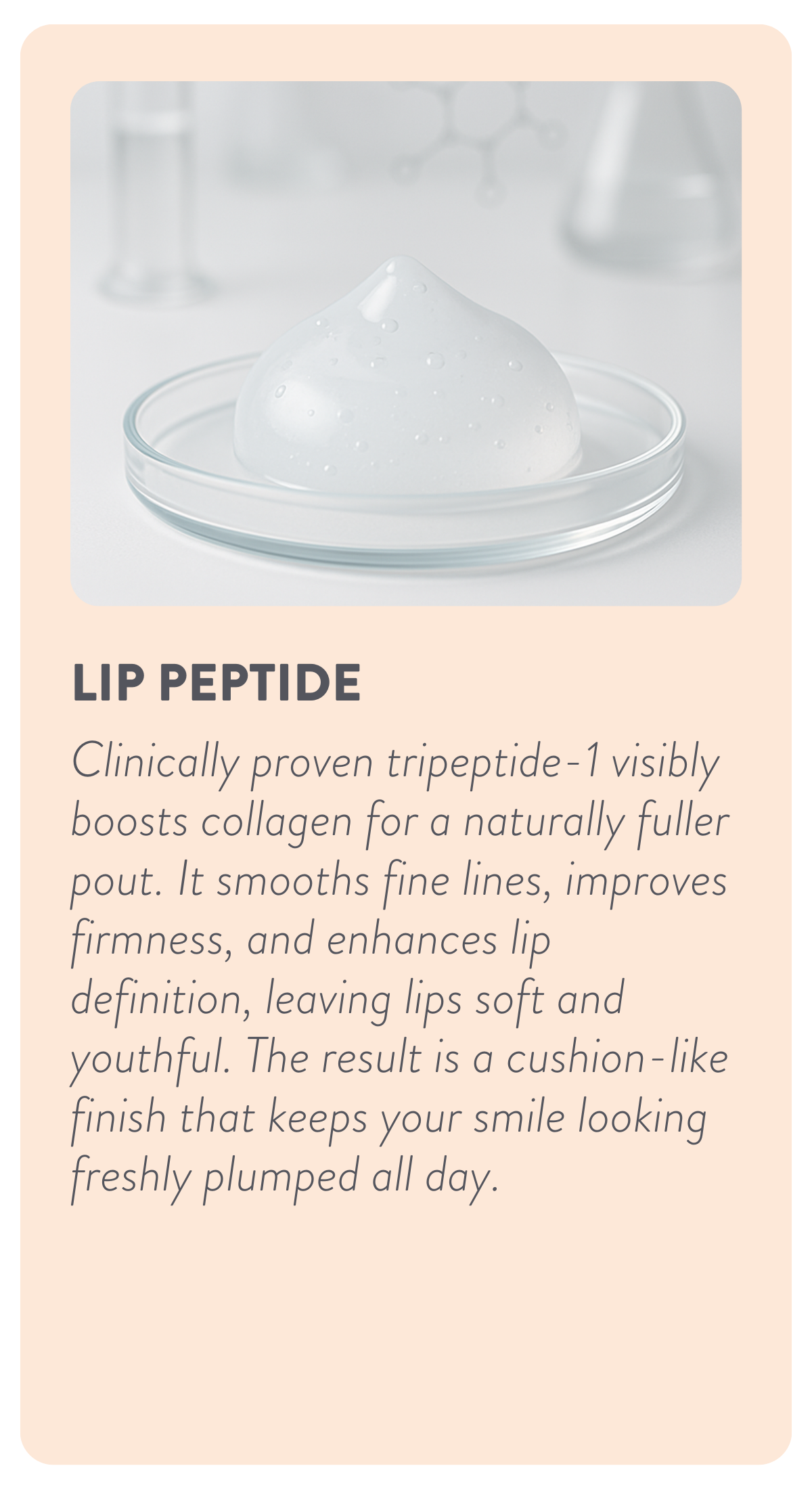 ELEVATE YOUR LIP CARE ROUTINE WITH OUR LIP PEPTIDE BALM. THIS SILKY, PEPTIDE-INFUSED FORMULA GIVES YOU PILLOW-SOFT PLUMPING AND LONG-LASTING HYDRATION FOR A FULLER, FRESHER POUT.