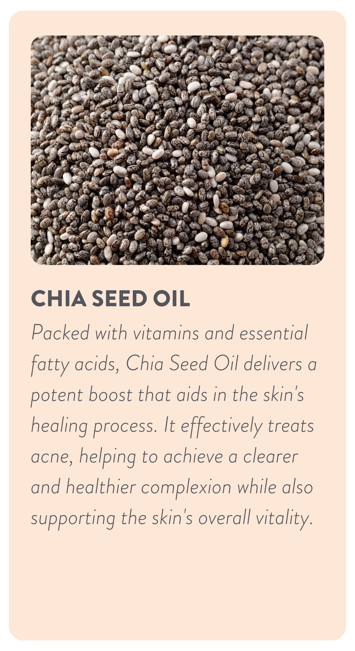 Shea Butter (Butyrospermum parkii), Argan Oil (Argania spinosa), Extra Virgin Olive Oil (Olea europaea), Calendula Oil (Calendula officinalis), Chia Seed Oil (Salvia hispanica), Grapeseed Oil (Vitis vinifera), Rose Hip Oil (Rosa rubiginosa), Frankincense Sacra Oil (Boswellia sacra), Lavender Oil (Lavandula angustifolia), Vitamin E (Tocopherol), Boronia Absolute Oil (Boronia megastigma), Lilac Absolute Oil (Syringa vulgaris), Hyacinth Absolute Oil (Hyacinthus orientalis), Black Currant Absolute Oil (Ribes nigrum).
