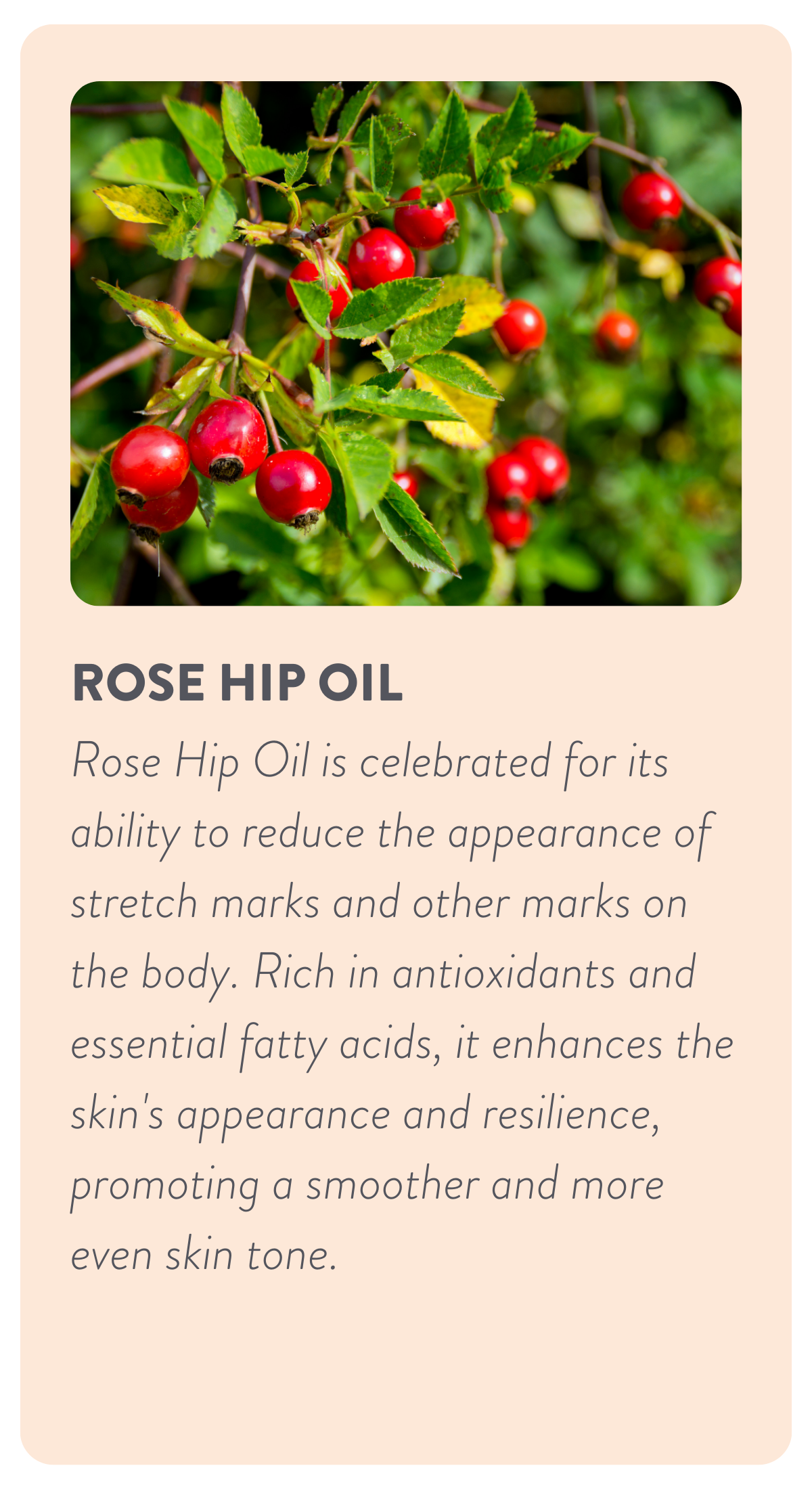 - Supports the healing process, reduces the appearance of stretch marks, and any other marks on your body.