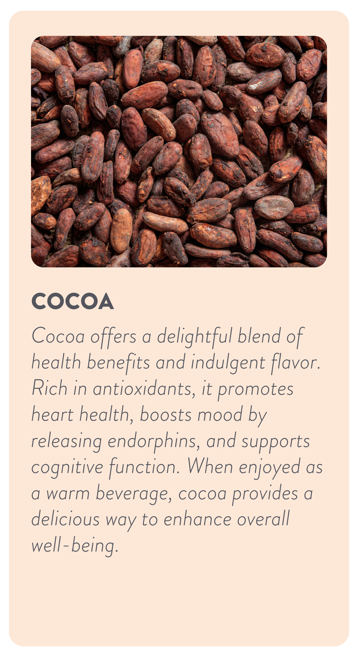 - Emotional support: Cocoa contains certain compounds, such as theobromine, that can have positive effects on mood and reduce stress.
