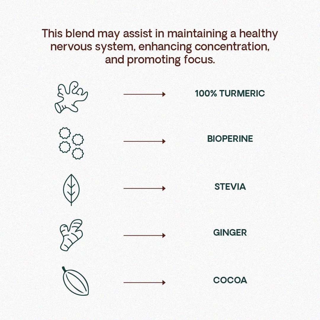 - Nervous system balance: Turmeric and cocoa work together to promote a healthy nervous system.