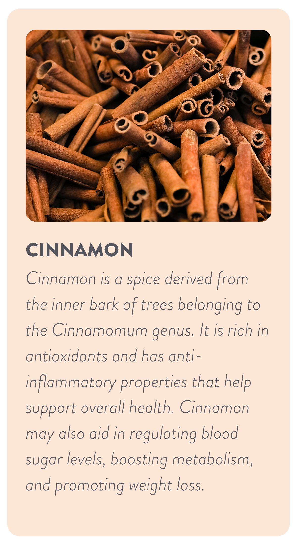 - Acceleration of metabolism: Cinnamon, known for its thermogenic capacity, helps accelerate metabolism and promotes the burning of calories.
