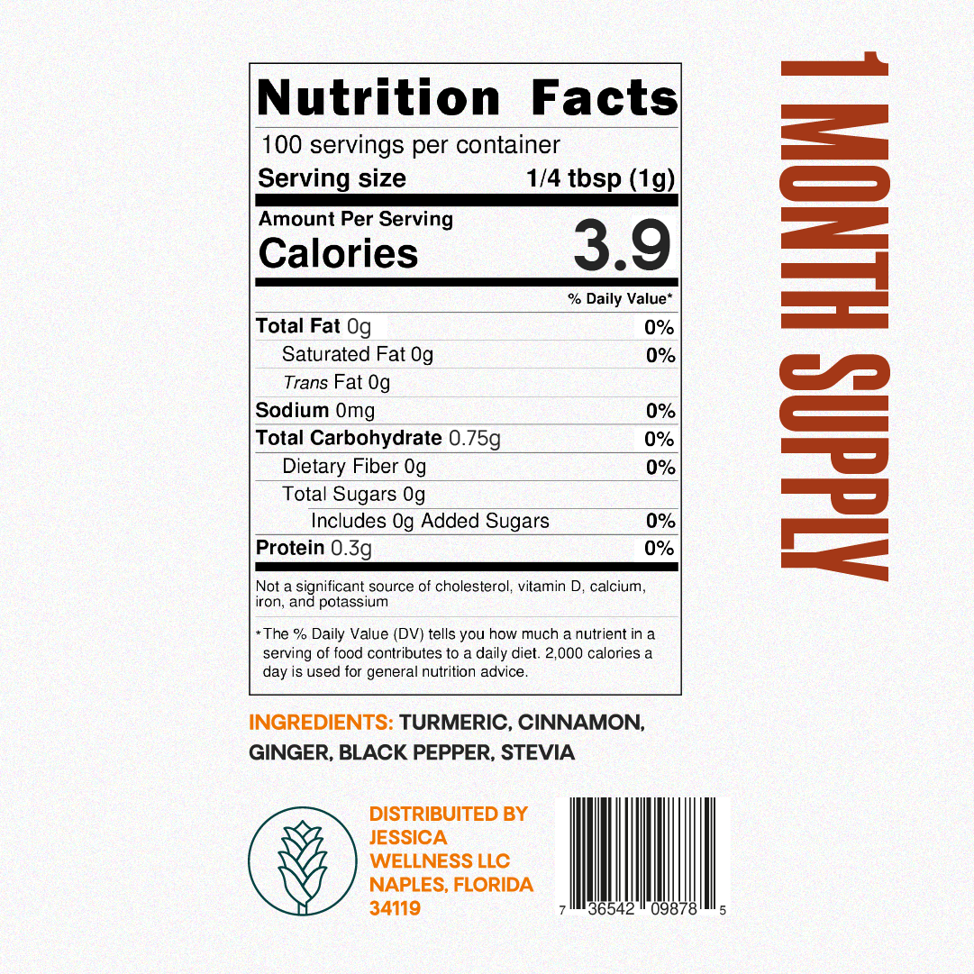 Organic Turmeric Powder (Curcuma longa L.), Organic Ginger Powder (Zingiber officinale), Organic Black Pepper Powder (Piper nigrum), Organic Stevia Powder (Stevia rebaudiana).