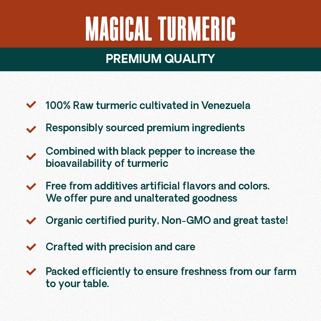 Hailing from the mountains of Central West Venezuela, our meticulous cultivation process and extended periods in mineral–enriched soils ensure the acquisition of therapeutic-grade turmeric.