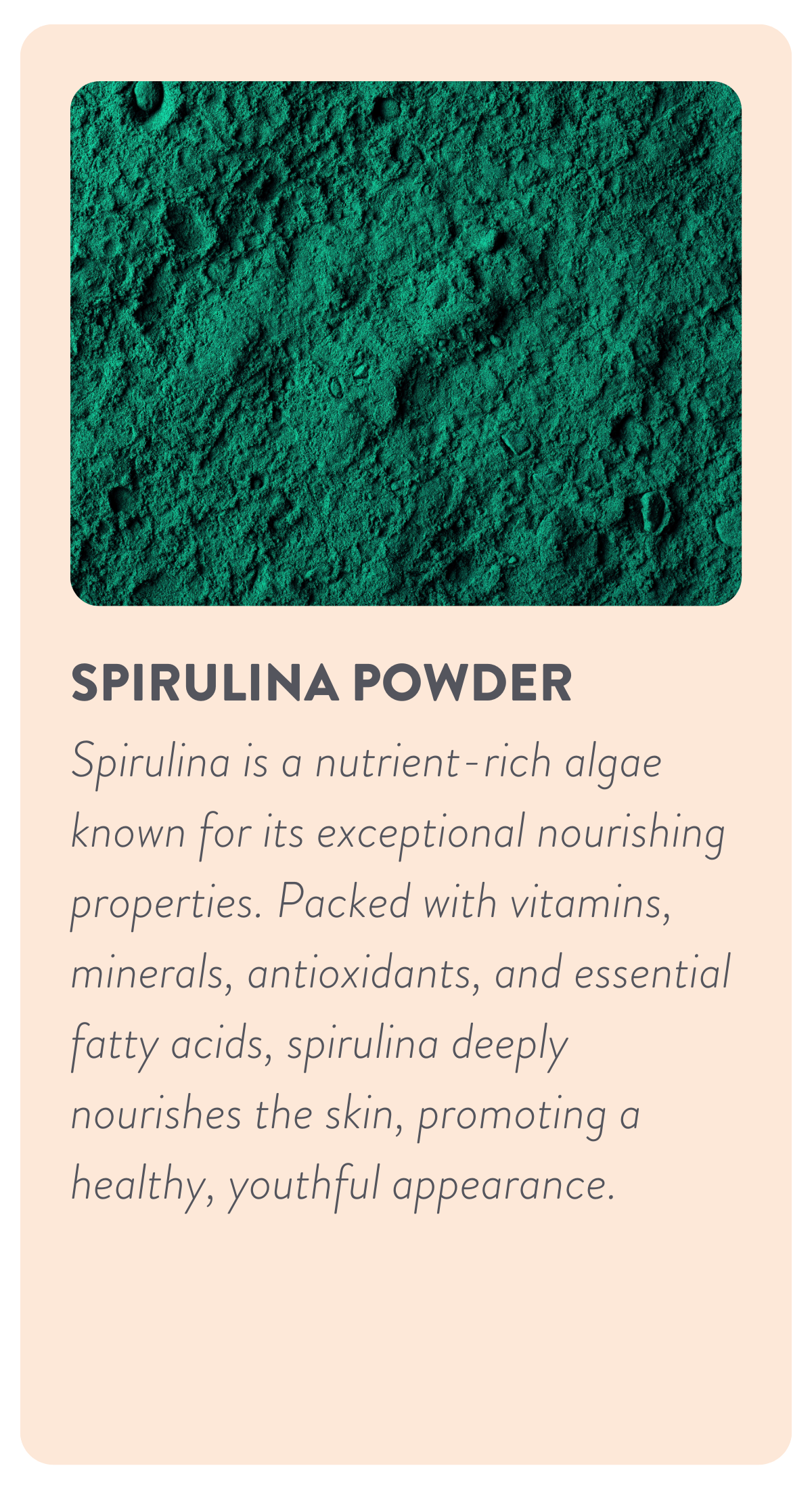 Mineral Mask is a gentle and delicate elixir to erase any imperfections left by the passage of time. It combines the powers of Moroccan clay, spirulina, and turmeric. Moroccan clay detoxifies and purifies the skin, spirulina is packed with deeply nourishing nutrients and turmeric, which has anti-inflammatory properties that brighten and rejuvenate. This mask has anti-aging, nourishing, and firming properties.