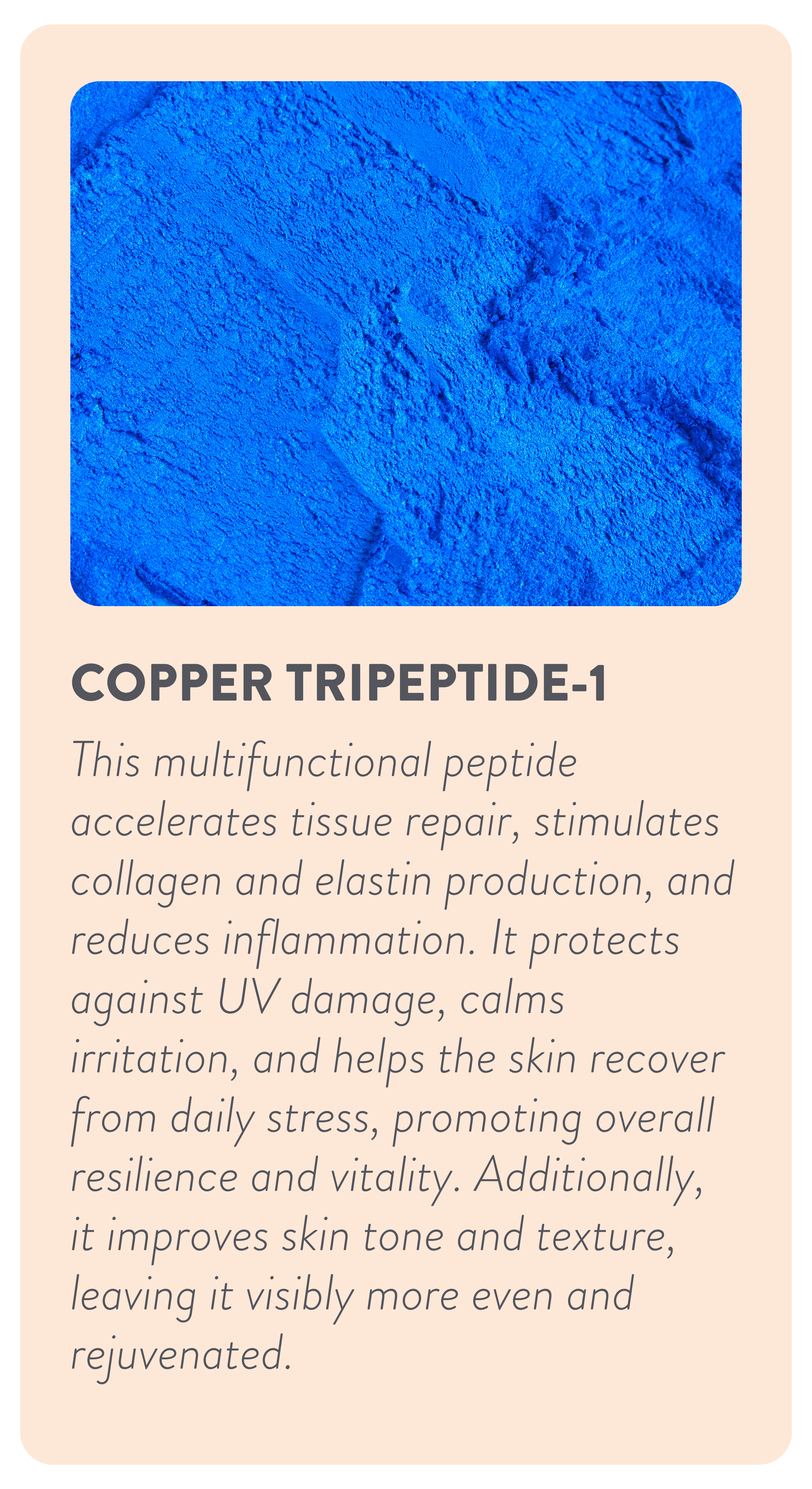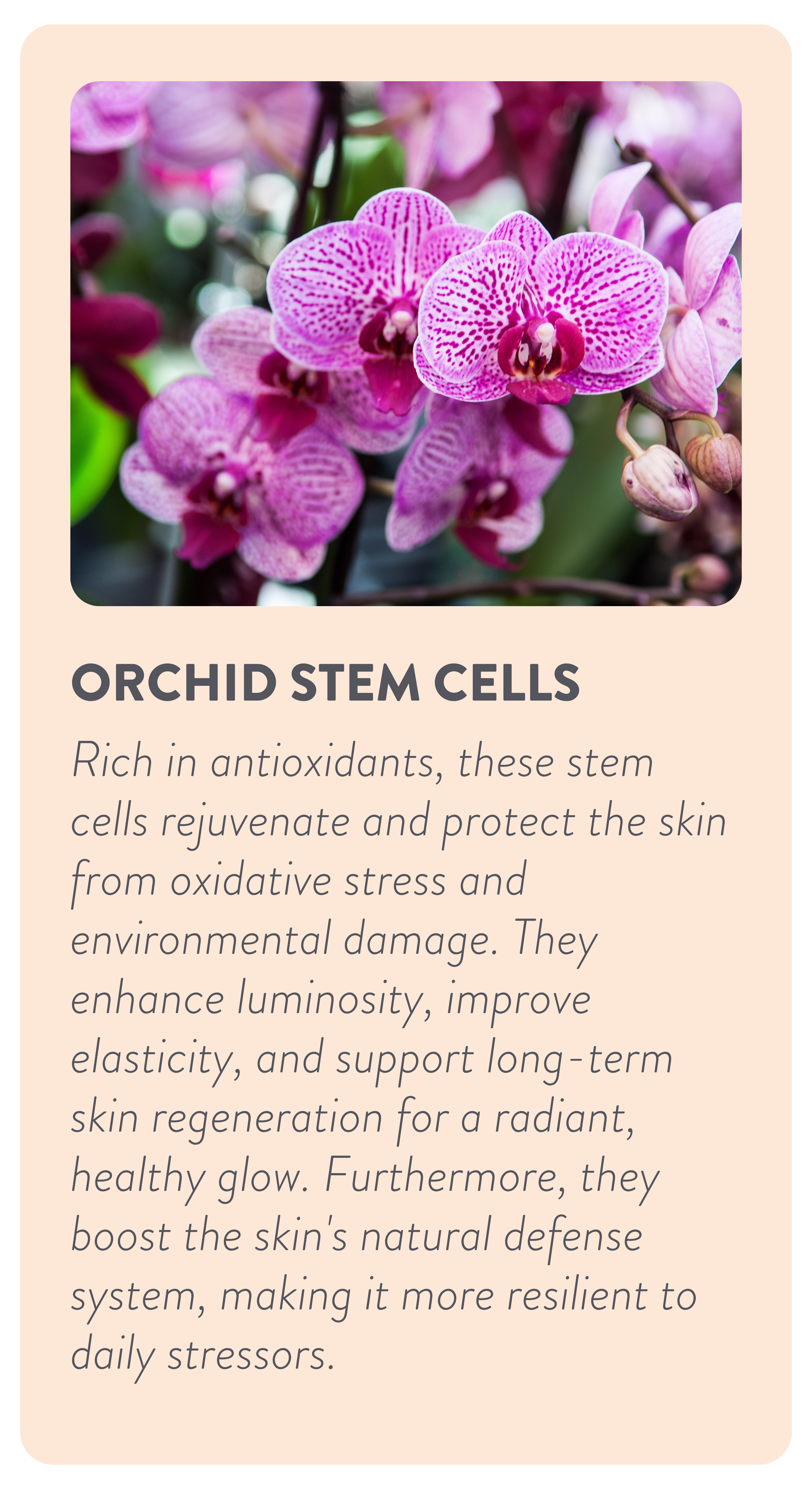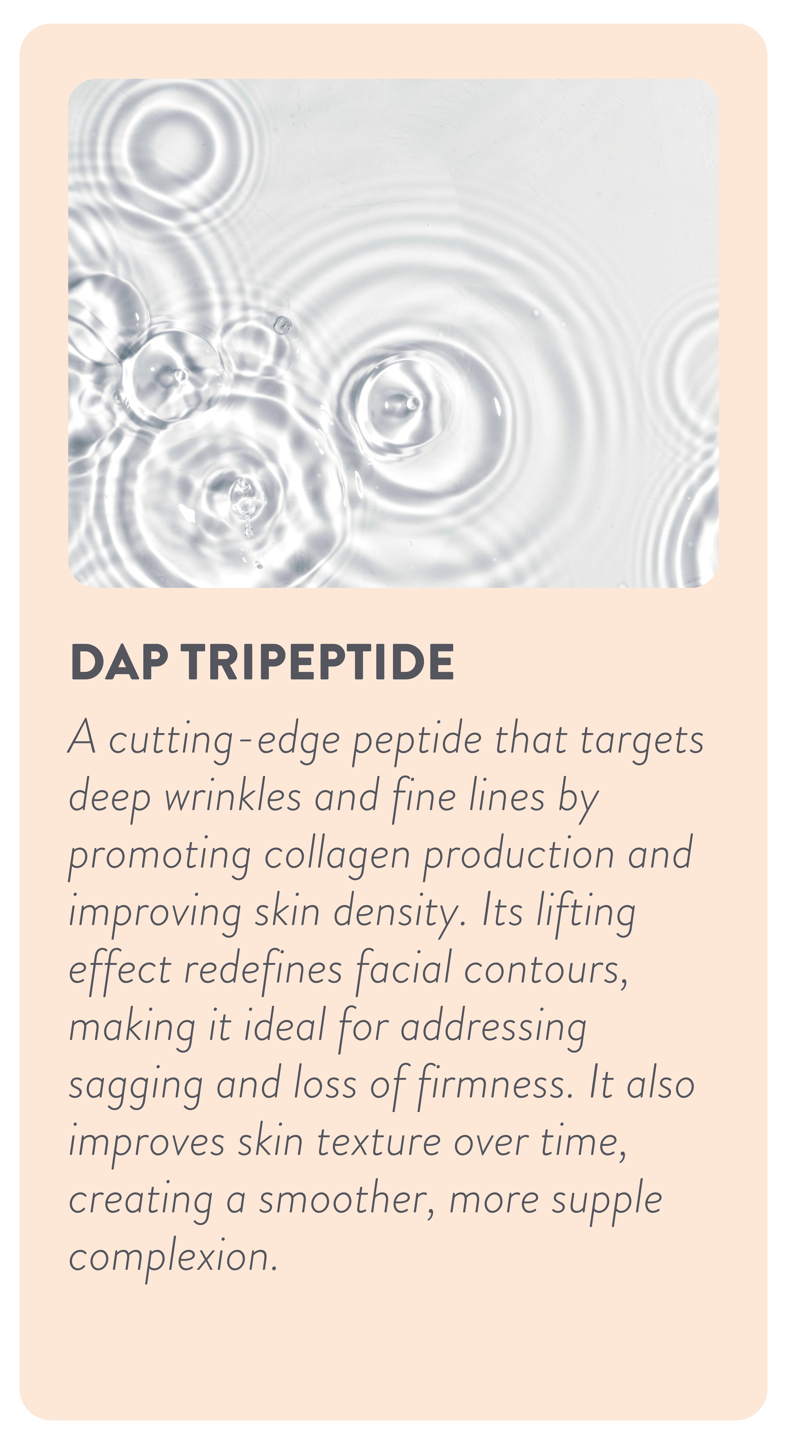 Jojoba Milk (Simmondsia chinensis), Aloe Vera Hydrosol (Aloe barbadensis), Jasmine Hydrosol (Jasminum officinale), Gotu Kola Extract (Centella asiatica), Argireline (Acetyl Hexapeptide-8), Glycan Booster (proprietary blend), DAP Tripeptide (synthetic peptide), Radish Fermented (Leuconostoc/Radish Root Ferment Filtrate from Raphanus sativus), Hyaluronic Acid MMW (Hyaluronic Acid), Orchid Stem Cells (Orchidaceae stem cells), Tripeptide-5 (Palmitoyl Tripeptide-5), Copper Tripeptide-1 (Copper Peptide), Blue Tansy Oil (Tanacetum annuum), Frankincense Sacra Oil (Boswellia sacra).
