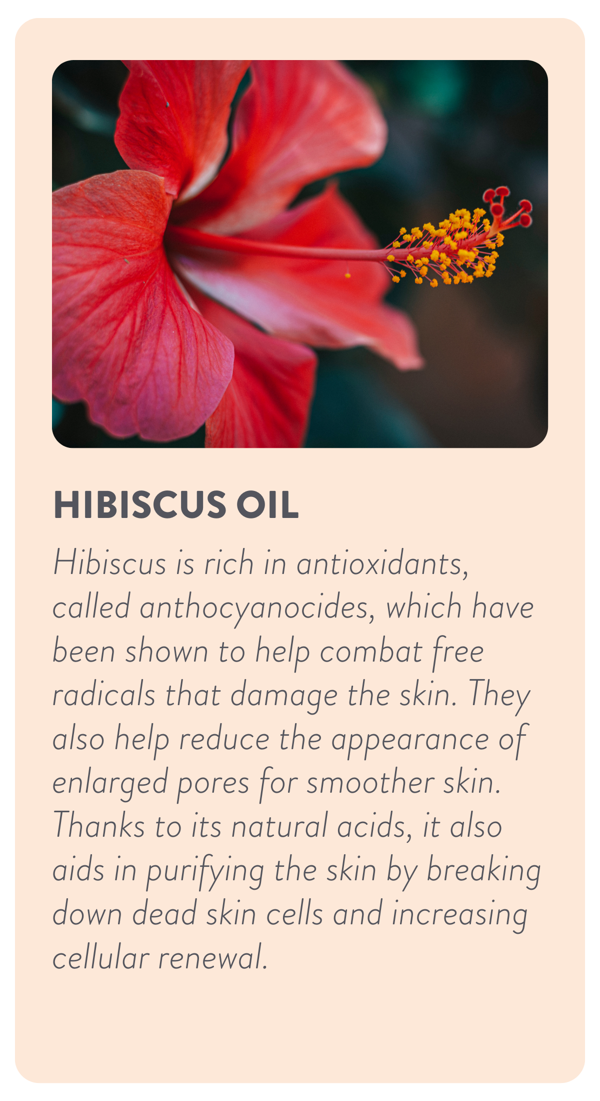 Macadamia Oil (Macadamia integrifolia), Argan Oil (Argania spinosa L.), Jojoba Oil (Simmondsia chinensis), Cacay Oil (Caryodendron orinocense), Rosehip Oil (Rosa rubiginosa), Buriti Oil (Mauritia flexuosa), Chia Seed Oil (Salvia hispanica), Hibiscus Extract (Hibiscus rosa-sinensis), Vitamin E, Vegetable-derived C13-15 Alkane, Sandalwood Oil (Santalum album), Rosewood Oil (Aniba rosaeodora), Rose Oil (Rosa damascena), Lavender Oil (Lavandula angustifolia), Patchouli Oil (Pogostemon cablin), Tuberose Absolute Oil (Polianthes tuberosa).