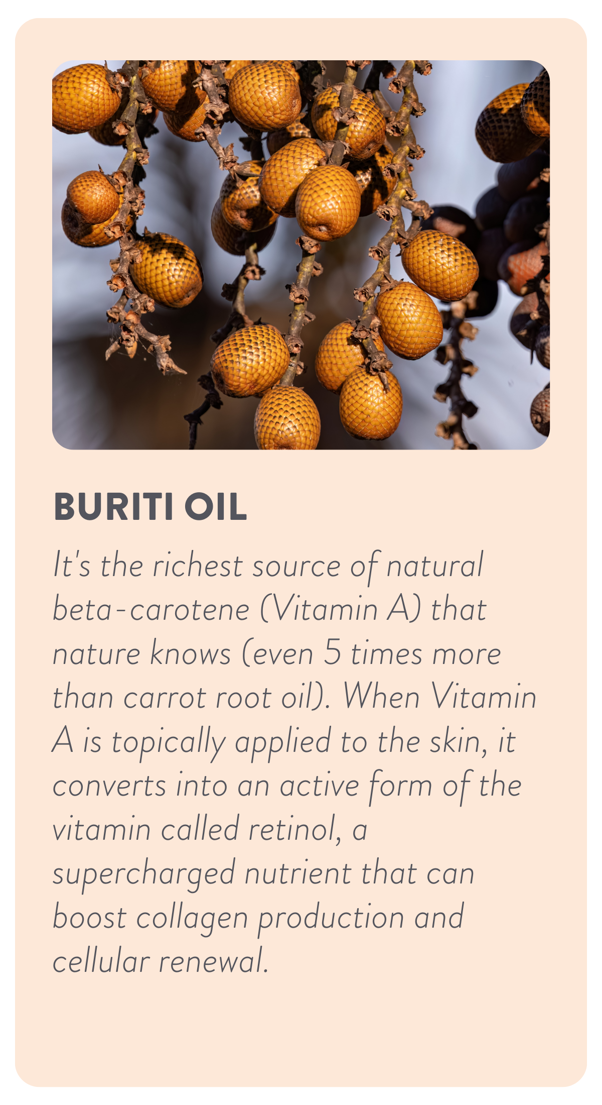 This formula features Buriti as one of its key ingredients, known as nature's richest source of natural beta-carotene (Vitamin A), even five times more potent than carrot root oil.
